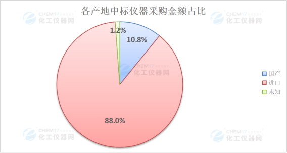 從“各產(chǎn)地中標(biāo)儀器采購金額占比”數(shù)據(jù)來看,11月國產(chǎn)質(zhì)譜儀的中標(biāo)金額為7668.145萬元,約占11月質(zhì)譜儀中標(biāo)總金額的10.8%;11月進(jìn)口質(zhì)譜儀的中標(biāo)金額為62266.524094萬元,約占11月質(zhì)譜儀中標(biāo)總金額的88.0%,進(jìn)口質(zhì)譜儀的中標(biāo)金額約是國產(chǎn)質(zhì)譜儀中標(biāo)金額的8.1倍。