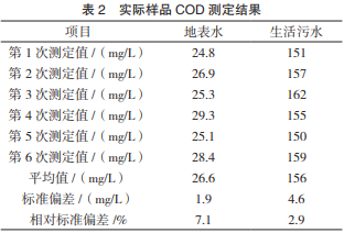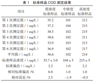 按照樣品分析步驟分別測定低、中、高3種不同濃度的COD標(biāo)準(zhǔn)樣品,各進(jìn)行6次重復(fù)性測定,測定結(jié)果如表1所示。從表1可以看出,3種濃度標(biāo)準(zhǔn)樣品的測定結(jié)果在保證值范圍內(nèi),相對(duì)誤差為-1.9%~2.5%,表明該方法測定水質(zhì)COD具有良好的正確度,能夠滿足試驗(yàn)要求。