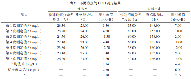目前,我國COD測定應(yīng)用最廣泛的方法是重鉻酸鹽法,選擇該方法作為快速消解分光光度法的對(duì)比方法。方法比對(duì)采用的實(shí)際樣品類型包括地表水和生活污水。每類樣品采集7個(gè)濃度水平接近的樣品,分別采用快速消解分光光度法和重鉻酸鹽法進(jìn)行測定,獲得7組配對(duì)測定數(shù)據(jù),對(duì)兩種方法的測定結(jié)果進(jìn)行t檢驗(yàn)[5-6],檢驗(yàn)結(jié)果如表3所示。
