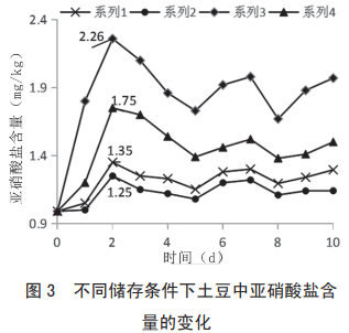 2.3 不同儲(chǔ)存溫度對(duì)亞硝酸鹽含量的影響