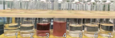 由圖1可知,乙腈(3號管)和乙腈水溶液(4號管)提取能力過強,很容易把樣品中各種色素提取出來。因分光光度法中,顏色的變化與濃度相關,可以直觀地反映出多酚的濃度水平。超強的提取力會干擾分光的測試結(jié)果,因此不適合作為本試驗的萃取溶劑。通過對剩下5種提取液顯色結(jié)果測試發(fā)現(xiàn),丙酮(7號管)做試劑空白時,顯色顏色與多酚目標物一致,吸光值很大,干擾測試結(jié)果。