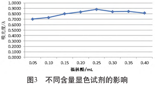 由圖3可知:隨著福林酚用量的增加,吸光度逐漸升高,當福林酚用量為0.25mL時,吸光度最大。但進一步增加福林酚,吸光度有下降的趨勢,因此確定本方法2mol/L福林酚溶液的加入量為0.25mL。
