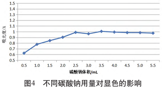 由圖4可知:隨著Na2CO3用量的增加,吸光度逐漸升高,當Na2CO3用量為2.5mL時,吸光度增加到最大。但進一步增加Na2CO3溶液用量時,吸光度變化幅度不大,最終確定本方法7.5%的Na2CO3溶液的加入量為2.5mL。