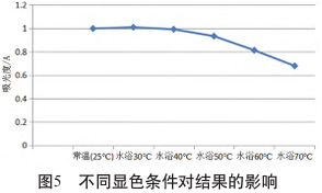 從圖5中可看出:在溫度范圍為25℃到40℃范圍內(nèi),隨著顯色溫度的升高,相同含量的溶液其吸光度無明顯差異,當溫度高于40℃時,隨著溫度逐漸升高,吸光度相應降低;說明溫度升高,不利于反應體系的穩(wěn)定。因此,本方法最終選擇常溫(約25℃)作為顯色條件。