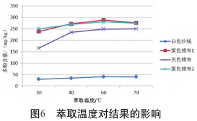 由圖6可知:隨著萃取溫度的升高,4份樣品的提取效率均呈現(xiàn)不同程度的增強,且在超聲溫度為60℃時,提取量最大,因此最終確定本方法萃取溫度為60℃。