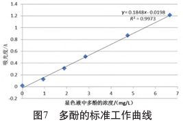 分別移取1mL中間工作液于離心管中,加入0.25mL的福林酚,搖勻反應3min,再加2.5mL的碳酸鈉溶液,然后用水定容,此時顯色液中多酚的濃度分別為0mg/L、0.95mg/L、1.90mg/L、2.85mg/L、4.75mg/L、6.65mg/L,分光光度法測試其吸光度,用線性對濃度和對應的吸光度進行線性擬合,其R2為0.9973,大于0.99,說明方法的線性良好。結(jié)果見圖7。