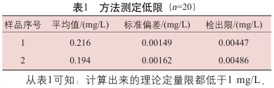 取2個空白樣品,按照優(yōu)化的試驗條件進行處理,并對空白樣品進行20次測定后,按照標準方程的適用范圍評估檢出限和定量限,檢出限(LOD)可按LOD=3×標準偏差,檢出限結(jié)果見表1。