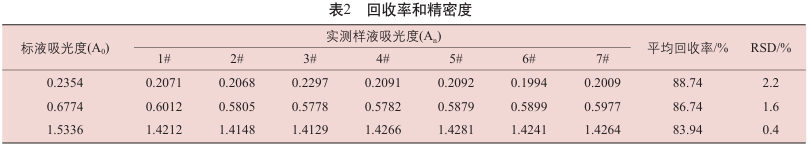 取樣品,剪成5mm×5mm試樣,稱取1.0g(精確到0.01g)剪碎的試樣,加入80mL的70%甲醇水溶液,加入一定體積的沒食子酸儲備液,制得3個不同水平含量(10mg/kg、20mg/kg、50mg/kg)的目標物,每個水平平行制備7個試樣,搖勻濕潤,超聲提取一定時間后,過濾提取液于60℃左右的溫度低真空下濃縮提取液少于5mL,轉(zhuǎn)移提取液至帶刻度的離心管中,加入一定量的水,使樣液在5mL左右,分別加入0.25mL的福林酚試劑,搖勻。反應3min,加入2.5mL的7.5%碳酸鈉溶液,加水定容至10mL、搖勻。室溫下放置60min。0.45μm膜過濾顯液后,用20mm比色皿、在765nm波長條件下用分光光度計測定吸光度?;厥章式Y(jié)果見表2。