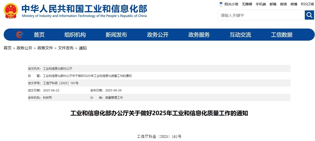 日前,工信部印發(fā)《關(guān)于做好2025年工業(yè)和信息化質(zhì)量工作的通知》(以下簡(jiǎn)稱《通知》)。旨在激勵(lì)制造業(yè)企業(yè)向卓越質(zhì)量攀升,打造更多“中國(guó)制造”卓著品牌,為推進(jìn)新型工業(yè)化,加快制造強(qiáng)國(guó)、質(zhì)量強(qiáng)國(guó)、網(wǎng)絡(luò)強(qiáng)國(guó)建設(shè)提供強(qiáng)有力支撐。