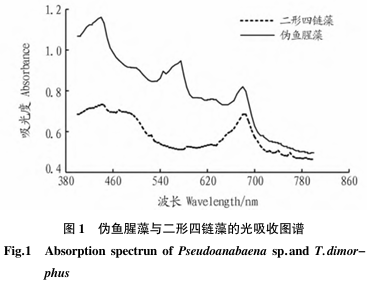 1.2藻種吸收光譜掃描偽魚腥藻和二形四鏈藻的吸光度使用紫外可見分光光度儀(UV-1100)測定,以蒸餾水調(diào)零,在400~800nm波長范圍內(nèi)掃描,掃描間隔為5nm。