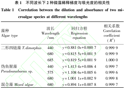 2.2藻種稀釋梯度與吸光度的相關(guān)性為驗證不同吸收峰波長下吸光度是否與藻密度有線性關(guān)系,分別在不同波長下測定各藻液密度的吸光度。結(jié)果表明(表1),2種藻液稀釋梯度(x)與其吸光度(y)之間均具有顯著線性相關(guān)(R2≥0.9996),偽魚腥藻680nm的相關(guān)系數(shù)略高于440和575nm,二形四鏈藻在440、680、685nm的相關(guān)系數(shù)差異不顯著。將2種藻液按體積比1∶1混合后配制成不同濃度梯度,在共同吸收峰波長680nm時,其稀釋梯度與混合藻液的吸光度之間仍具有顯著線性相關(guān)(R2=0.9997)。