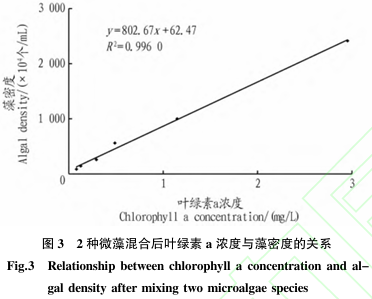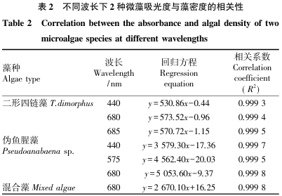 2.3藻種吸光度與藻密度的相關(guān)性分析吸光度和藻密度之間的相關(guān)性(表2),2種微藻在各自吸收峰處,吸光度(x)和藻密度(y)均存在顯著的線性相關(guān)(R2≥0.9993),這表明在試驗波長條件下藻液的吸光度能夠反映藻液的藻細(xì)胞密度;但藻液在680nm處的R2略高于440nm處;在680nm處,混合藻液的吸光度與總藻細(xì)胞密度之間也具有顯著的線性相關(guān)(R2=0.9998),說明OD680可以相對準(zhǔn)確地反映出試驗藻混合藻液的細(xì)胞密度。