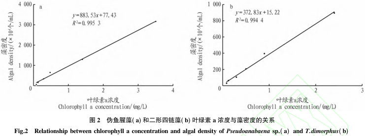 1.4純種藻葉綠素a的相關(guān)性分析取指數(shù)期上述2種藻液,用蒸餾水稀釋0、2.5、5.0、10.0、20.0、40.0倍,配制成不同濃度梯度,每梯度3個平行,取一定量體積,用whatman玻璃纖維濾膜(25mm)過濾,立即將濾膜對折于試管中,加入5mL95%的乙醇溶液,4℃冰箱中避光萃取24h,期間數(shù)次搖晃。將萃取后的上清液于恒溫離心機中以5000r/min離心10min,取上清液分別在波長665、649nm下測吸光度,葉綠素a濃度的計算根據(jù)李合生[20]的方法進行。同時對每梯度藻細(xì)胞進行計數(shù),方法同“1.3”。以此結(jié)果進行葉綠素a濃度與藻密度之間的相關(guān)性分析。