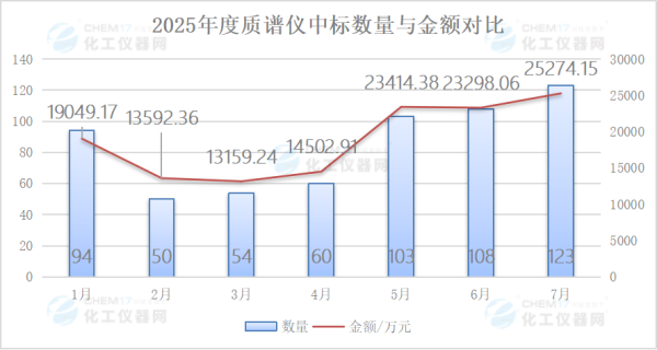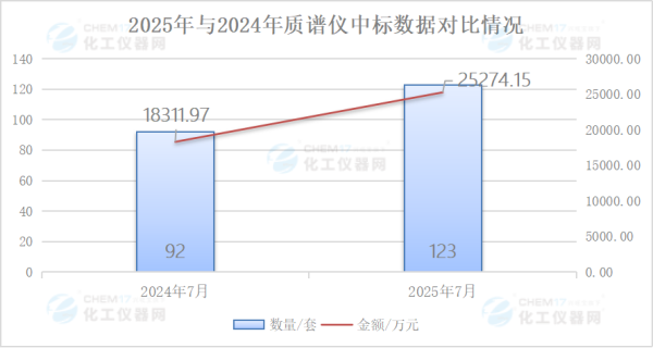 從“2025年與2024年質(zhì)譜儀中標(biāo)數(shù)據(jù)對(duì)比情況”中可以看出,2025年質(zhì)譜儀市場(chǎng)需求依舊在增長(zhǎng)。2025年7月中國(guó)政府采購網(wǎng)可統(tǒng)計(jì)到的質(zhì)譜儀中標(biāo)數(shù)量為123套,同比增長(zhǎng)33.90%;中標(biāo)金額為25274.1485萬元,同比增長(zhǎng)38.02%。