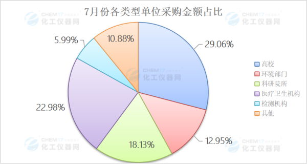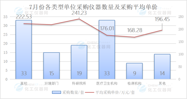 7月各單位采購質(zhì)譜儀的平均單價(jià)在168-242萬元/套之間。其中,科研院所的平均采購單價(jià)最高,平均采購單價(jià)為241.23萬元/套。其次為高校,平均采購單價(jià)為222.53萬元/套。近期,科研院所與高校對(duì)高端質(zhì)譜儀的需求量較大。