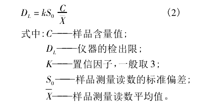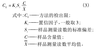 方法的檢出限是指一個給定的分析方法在特定條件下能以合理的置信水平檢出被測物的最小濃度,它是表征分析方法的最主要的參數(shù)之一。分析方法隨機誤差的大小不但與儀器噪聲有關(guān),而且決定了方法全過程所帶來的誤差總和,與樣品性質(zhì)、預(yù)處理過程都有關(guān)系。為了能反映分析方法在整個分析處理過程的誤差,可采用已知結(jié)果的標準物質(zhì)或樣品按照分析步驟進行測量,通過分析12份已知結(jié)果的實際樣品來計算方法的檢出限,計算公式如下: