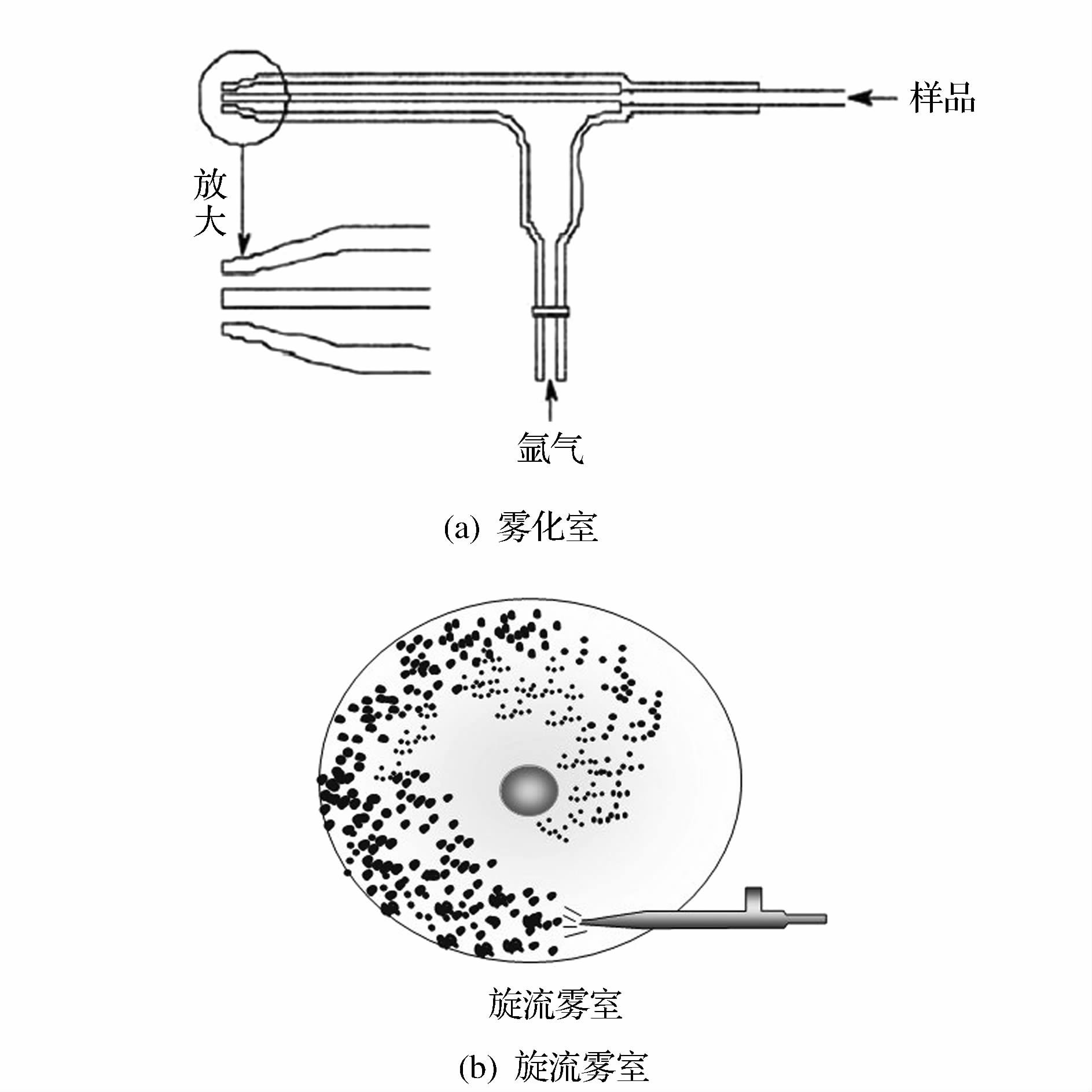 霧室的作用是對霧化器噴入的霧滴進行選擇,去除電離效率低的大霧滴,選擇小顆粒(10μm)的霧滴進入等離子體。經(jīng)過霧室的篩選,僅有1%~2%的樣品進入到等離子體。由于每次分析都會有樣品殘留在霧室中,因此在分析結(jié)束后應(yīng)用硝酸(2%)和去離子水反復(fù)沖洗霧室,使用一段時間后(視樣品多少而定),若霧室附著肉眼可見的沉積物,將霧室卸下浸泡在硝酸(5%)48 h后進行超聲清洗,再用去離子水清洗,烘干后即可使用。圖2為進樣系統(tǒng)主要部件工作示意圖。