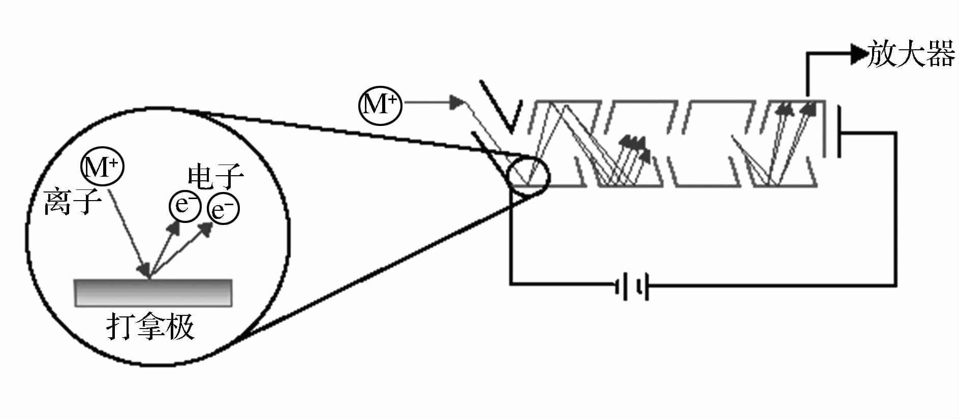 電感耦合等離子體質(zhì)譜儀(ICP-MS6880)采用雙階倍增檢測器,可以同時獲得模擬和脈沖信號,線性動態(tài)范圍較寬。圖7為檢測器工作原理示意圖??梢钥闯鰴z測器主要作用是放大檢測到的目標(biāo)離子信號,因此,檢測器使用一段時間之后會有“疲勞效應(yīng)”,導(dǎo)致靈敏度下降;另外,電子倍增器壽命取決于總的積累放電次數(shù),進入高濃度樣品會加速檢測器內(nèi)表涂層消耗,縮短檢測器壽命。在分析環(huán)境樣品時,尤其是工業(yè)廢水和工業(yè)用地土壤,建議采用基體稀釋的辦法,避免長時間檢測高濃度信號。