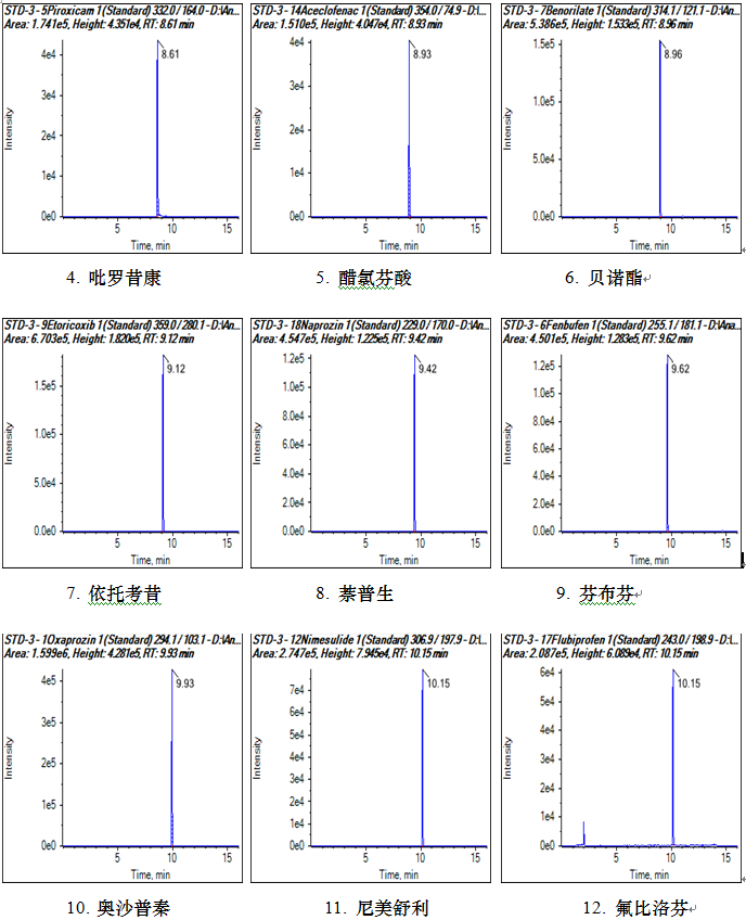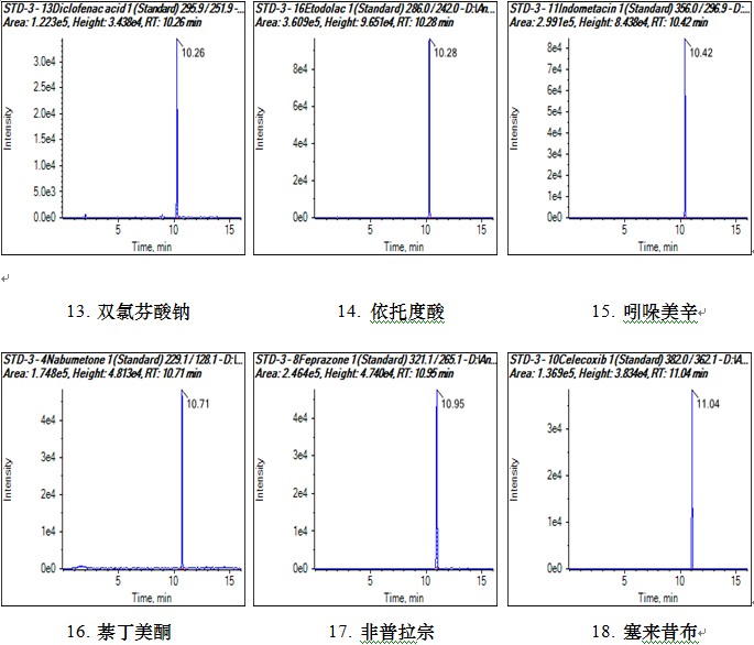 美洛昔康、舒林酸、吡羅昔康、貝諾酯、依托考昔、奧沙普秦、雙氯芬酸鈉、依托度酸、非普拉宗定量限為0.5 mg/kg;二氟尼柳、醋氯芬酸、萘普生、芬布芬、尼美舒利、氟比洛芬、吲哚美辛、萘丁美酮、塞來昔布定量限為2.5 mg/kg。