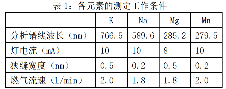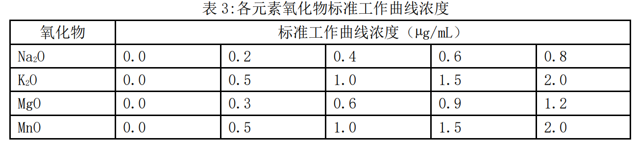 用KCl、NaCl、MgO、MnSO4·H2O分別配制成0.05mg/mL的各元素氧化物標準溶液待用,然后再經過稀釋配制成所需要的濃度。以K2O為例,如取5mL0.05mg/mL的K2O標準溶液加入到500mL容量瓶中,加入30mLHCl,10mLCsCl溶液,定容搖勻。則此溶液K2O的濃度為0.5μg/mL,依此類推可根據(jù)需要配制成各種不同的氧化物濃度。(見表3)