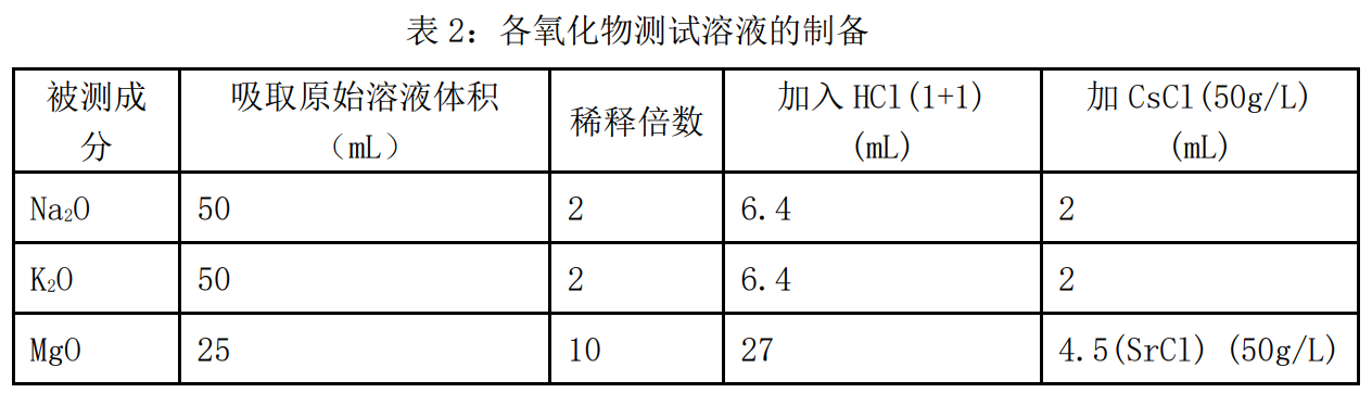 SrCl (50g/L)或CsCl (50g/L)。使測試溶液和標準曲線溶液中HCl濃度及SrCl 或CsCl的濃度保持一致。各氧化物的測試溶液制備方法如表2所示: