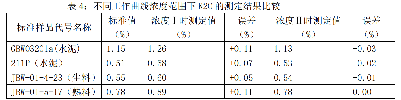 選擇最佳工作曲線濃度范圍的原則,其一是根據(jù)樣品中被測成分的大致含量,應在滿足儀器分析條件的基礎上盡量減少稱樣量;其二是要使測量值盡量處在工作曲線中部范圍內。下面是同一樣品不同稱樣量,用同樣的制備方法在不同的標準工作曲線濃度范圍下測定K2O時得出的結果比較。其中濃度Ⅰ為K2O濃度(0.0;1.0;2.0;3.0;4.0)μg/mL,稱樣量為0.2g;濃度Ⅱ為K2O濃度(0.0;0.5;1.0;1.5;2.0)μg/mL,稱樣量為0.1g。見表4