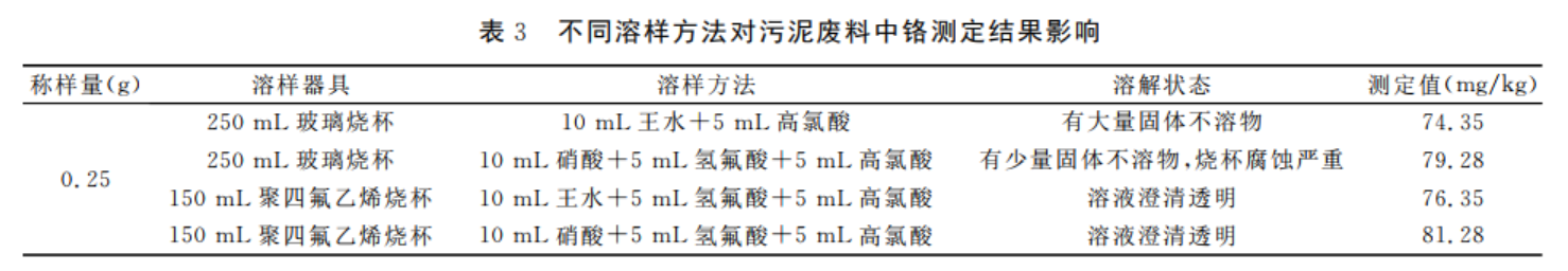 由表3可以看出:方法1溶解樣品后,有大量固體不溶物,因為沒加氫氟酸,污泥廢料中的硅未被溶解;方法2溶解樣品后有少量固體不溶物,而且燒杯腐蝕嚴(yán)重;方法3,樣品溶解完全,但鉻元素測定結(jié)果偏低;方法4樣品溶解完全,鉻測定結(jié)果與分光光度法測定結(jié)果一致。所以選擇方法4作為溶解污泥廢料的方式。