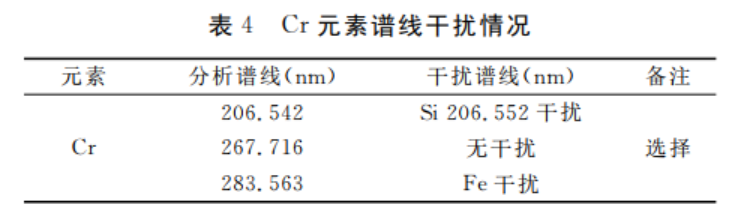 從表5結(jié)果可以看出:試液中含有的鐵量對鉻元素測量影響不大,直接用不加鐵的鉻標(biāo)準(zhǔn)溶液系列測定即可。鐵對鉻的測定無影響。
