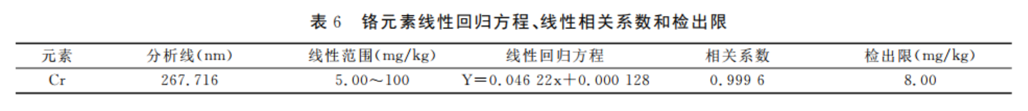 在儀器最佳工作條件下對標(biāo)準(zhǔn)溶液系列進(jìn)行測定,以鉻元素質(zhì)量濃度為橫坐標(biāo),發(fā)射強度為縱坐標(biāo),繪制標(biāo)準(zhǔn)曲線。在同樣條件下對空白溶液連續(xù)測定11次,計算標(biāo)準(zhǔn)偏差,以3倍的標(biāo)準(zhǔn)偏差計算方法的檢出限,結(jié)果見表6。