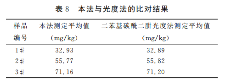 取三個樣品,按照實驗方法測定污泥廢料中的鉻,又將這三個樣品用二苯基碳酰二肼光度法測定,將兩種方法測得的結(jié)果進(jìn)行對比,結(jié)果見表8。