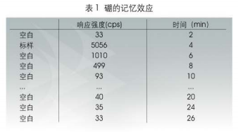 在硼元素的測(cè)定中發(fā)現(xiàn),經(jīng)過(guò)高濃度標(biāo)樣測(cè)定后,硼的空白值隨之明顯升高,說(shuō)明硼有較強(qiáng)的“記憶效應(yīng)”(典型的變化見(jiàn)表1)。