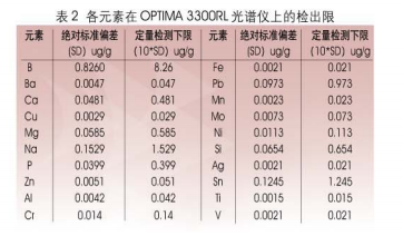關(guān)于定量檢測(cè)下限,美國(guó)國(guó)家標(biāo)準(zhǔn)局定義為(1:10倍空白標(biāo)準(zhǔn)偏差為樣品的定量檢測(cè)下限。按上述定義,我們配制了有機(jī)法的空白溶液,進(jìn)行20次重復(fù)測(cè)定,得到其測(cè)定值的絕對(duì)標(biāo)準(zhǔn)偏差SD,由此各元素相應(yīng)的定量檢測(cè)下限見(jiàn)表2。