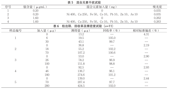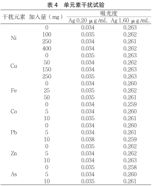 試驗(yàn)數(shù)據(jù)表明,于0.20μg/mL和1.60μg/mL的銀標(biāo)準(zhǔn)溶液中分別加入最大量各共存單元素,即相當(dāng)于樣品中的干擾元素含量滿足Ni80%、Cu50%、Fe10%、Co2%、Pb2%、Zn2%、As2%的條件時(shí),其對(duì)待測元素銀的測定基本無影響。