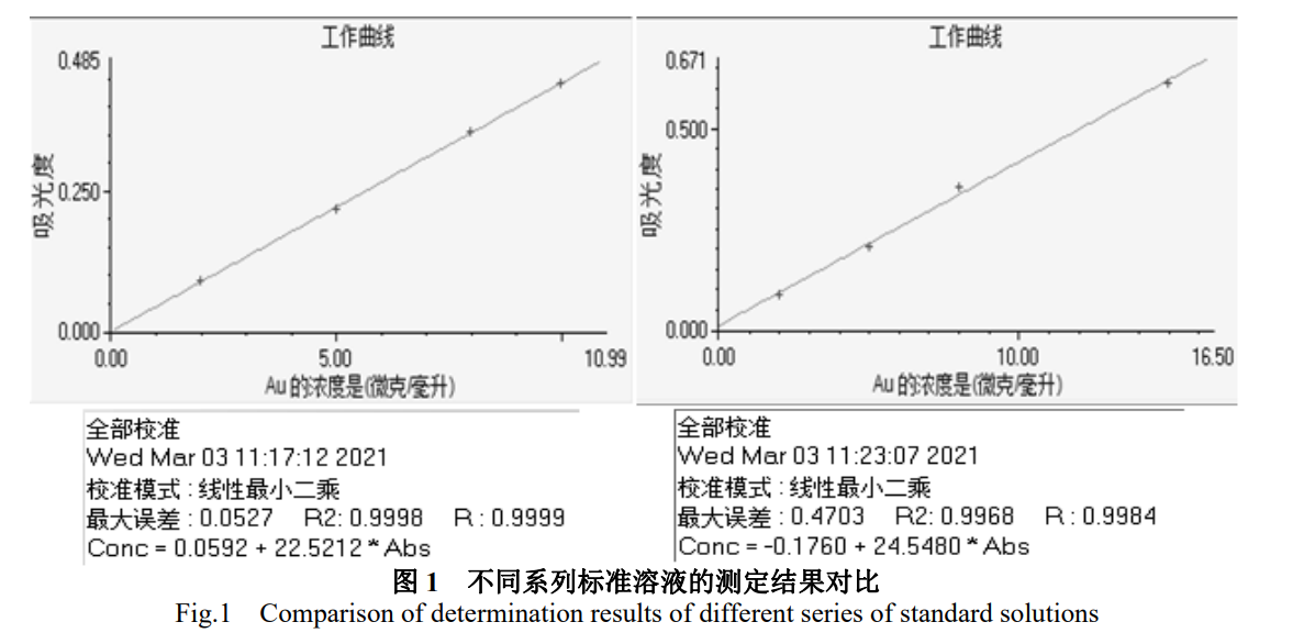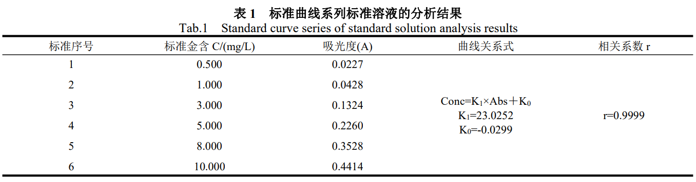 在測量標(biāo)準(zhǔn)溶液的同時(shí)測量試驗(yàn)樣品和空白樣品,由扣除空 白后樣品的吸光度 Abs 樣,依標(biāo)準(zhǔn)曲線計(jì)算出樣品中的元素金含 量 Conc 樣。