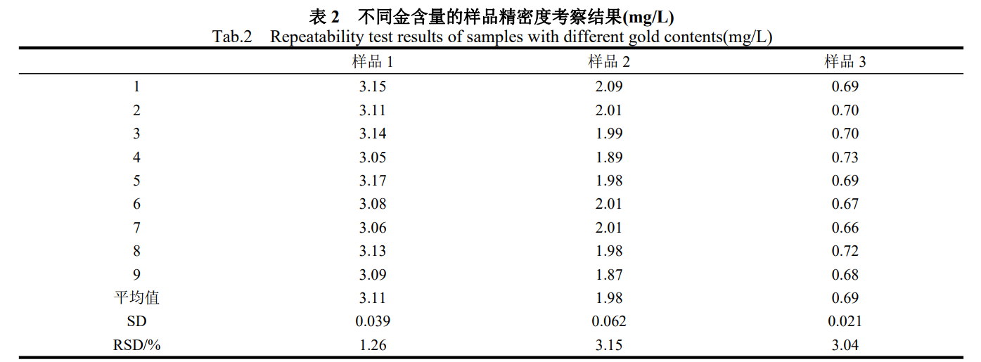 本方法具有準(zhǔn)確可靠、簡便快速、選擇性強(qiáng)、干擾少等優(yōu)點(diǎn)。 相比較電感耦合等離子體質(zhì)譜法測金成本低、效率高、維護(hù)簡單 的優(yōu)勢。該方法測定污酸廢水中金元素,其靈敏度、精密度和準(zhǔn) 確度均滿足要求。選擇本文提供的儀器參數(shù)和方法,有利于準(zhǔn)確、 精密的測定元素金。同時(shí),為基體復(fù)雜而目標(biāo)元素含量低的測定 創(chuàng)造了條件。