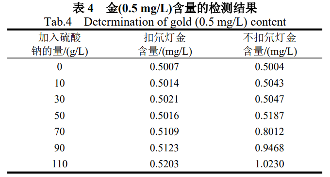 從表 4 可以看出:硫酸鈉含量低于 50 g/L 時(shí),鹽份對檢測結(jié) 果沒有太大的影響??梢灾苯訙y定。硫酸鈉含量超過 50 g/L 時(shí), 氘燈扣背景法能較好的消除背景干擾,使測定結(jié)果更接近實(shí)際值。