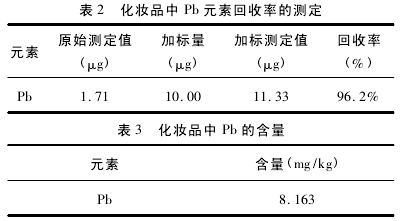 按照儀器工作條件對化妝品的 Pb 進(jìn)行測定,同時(shí)為了考察方法的準(zhǔn)確度,又對樣品進(jìn)行加標(biāo)回收試驗(yàn),結(jié)果見表2和表3.從表2中還可看出,加標(biāo)回收率為96. 2% ,表明本實(shí)驗(yàn)準(zhǔn)確度較高,穩(wěn)定性良好,結(jié)果可靠。從表3 中可以看出所選化妝品中Pb含量為:8. 16 mg/kg.