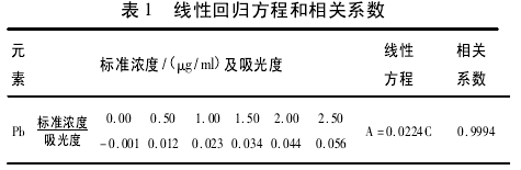 按照 1. 2. 2 中儀器工作條件測定 Pb 標(biāo)準(zhǔn)系列溶液的吸光度,根據(jù)數(shù)據(jù)計(jì)算得到對應(yīng)的回歸方程以及相關(guān)系數(shù)( 見表 1) ,從表中可看出各標(biāo)準(zhǔn)系列溶液的工作曲線線性關(guān)系良好。