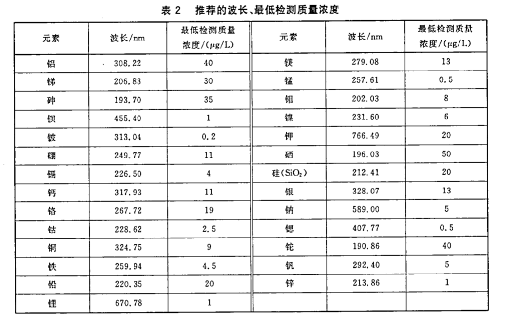 本法對(duì)各種元素的最低檢測(cè)質(zhì)量濃度﹑所用測(cè)量波長(zhǎng)列于表2中。