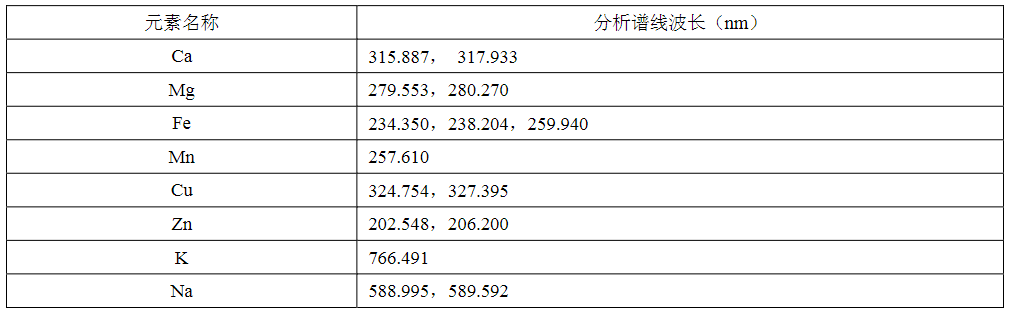 試樣經(jīng)干法灰化消解,稀釋至合適體積后用美析ICP-6800電感耦合等離子體原子發(fā)射光譜儀測(cè)定,外標(biāo)法定量。